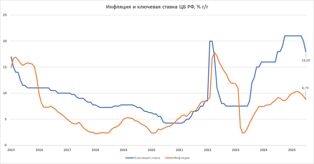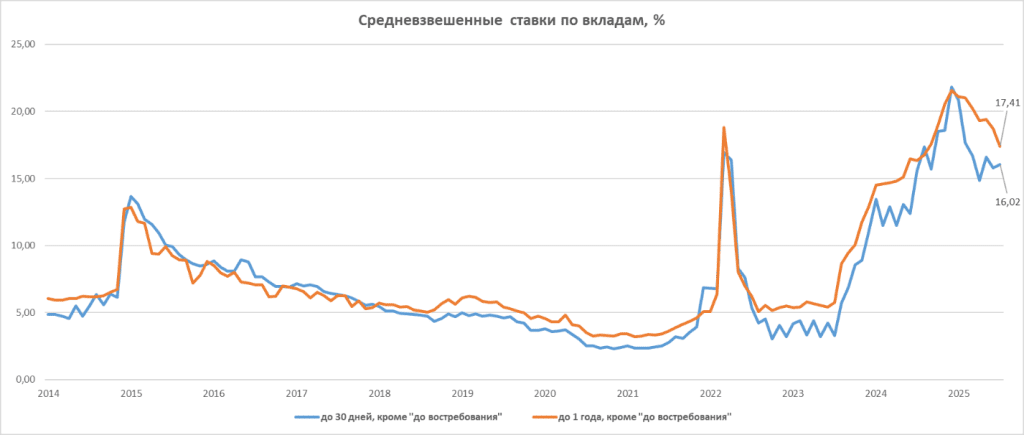 Процентная ставка по банковским вкладам идет по пятам за ключевой. Согласно данным ЦБ РФ, средневзвешенная доходность по годовым вкладам снизилась с 21,4% в декабре до 17,4% в июле.