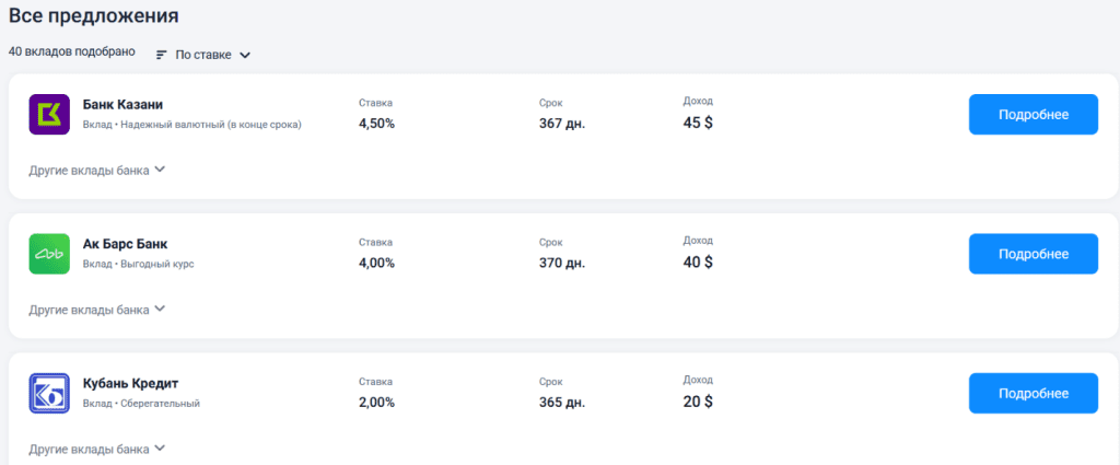 Защититься от падения рубля можно вкладами в валюте. По данным агрегатора, лучшие условия предоставляет Банк Казани с 4,5% годовых при открытии счета в долларах США и 4,0% — в евро. На втором месте Ак Барс с 4,0 и 3,5% соответственно; а на третьем месте — Кубань Кредит, который открывает вклад только в долларах США: 2,0% годовых при сумме от $1000 и 3,0% — от $50 000.