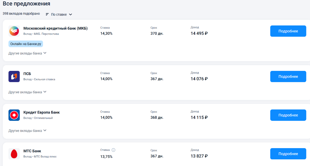 По состоянию на начало сентября текущие предложения банков еще скромнее. Рассмотрим показатели с агрегатора Банки.ру для вкладов от 100 тыс. руб. Лучшую ставку в 14,3% предлагает МКБ, второе место с 14,0% разделяют ПСБ и Кредит Европа Банк.