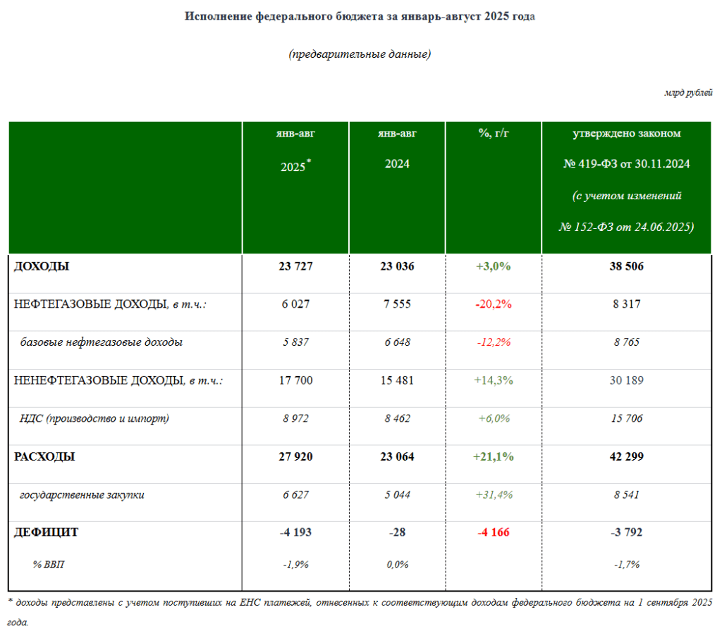 В сентябре Минфин опубликовал неутешительные предварительные данные: за период январь‒август падение нефтегазовых доходов достигло 20% по отношению к аналогичному периоду предыдущего года. Дефицит бюджета при этом составил 4,2 трлн руб., или 1,9% от ВВП, что сильно разнится с утвержденным на 2025 год показателем в 1,2 трлн руб. или 0,5% от ВВП.