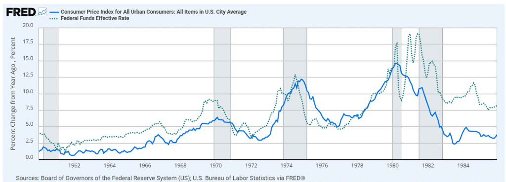 На графике хорошо видно, как мягкая монетарная политика ведет к еще большему росту цен: только приход Пола Волкера в ФРС и значительное повышение ключевой ставки в 1980-х смогли развернуть инфляционную спираль.