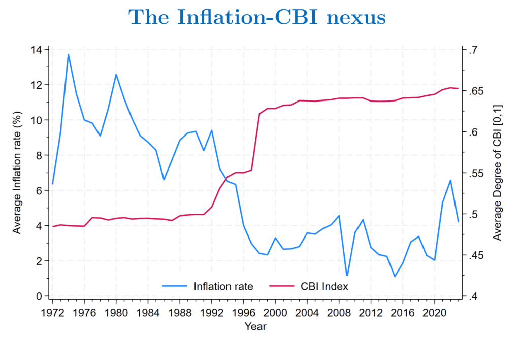 Необходимость в крепкой руке Центробанка имеет подтверждение не только в виде постулатов, но также математических моделей и статистических исследований. В 2022 году итальянским экономистом Давидом Ромелли был предложен индекс независимости центральных банков (CBI), который показал высокую корреляцию с инфляцией. CBI измеряет степень независимости центральных банков от правительств на основе анализа их уставов, местного законодательства, а также методов назначения руководства, целей денежно-кредитной политики, ограничений на кредитование государства и прозрачности деятельности. CBI получил высокое признание и используется в методологиях учета такими организациями, как МВФ, CEPR и SUERF.