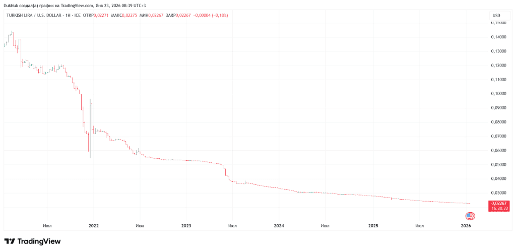 Помимо товаров, повышенным спросом стали пользоваться иностранные валюты и криптовалюта. Это оказало негативное влияние на лиру. Пожар стали тушить при помощи золотовалютных резервов, покупая на них нацвалюту. Но, как и с ИО, это дало обратный эффект — экономические субъекты увидели, как быстро тает финансовая подушка страны, и, поддавшись панике, только нарастили покупку «твердых» финансовых инструментов. Курс лиры обрушился как карточный домик, а денег на спасение больше не оставалось: за пять лет она потеряла 84% стоимости по отношению к доллару.